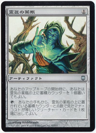 (T):あなたの手札にある、点数で見たマナ・コストが霊気の薬瓶の上に置かれている蓄積カウンターの数に等しいクリーチャー・カードを1枚、戦場に出してもよい。