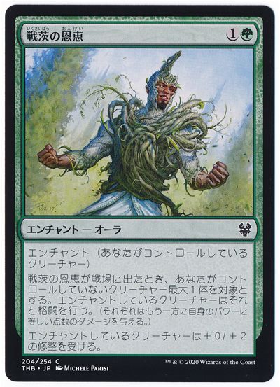戦茨の恩恵が戦場に出たとき、あなたがコントロールしていないクリーチャー最大1体を対象とする。エンチャントしているクリーチャーはそれと格闘を行う。(それぞれはもう一方に自身のパワーに等しい点数のダメージを与える。)